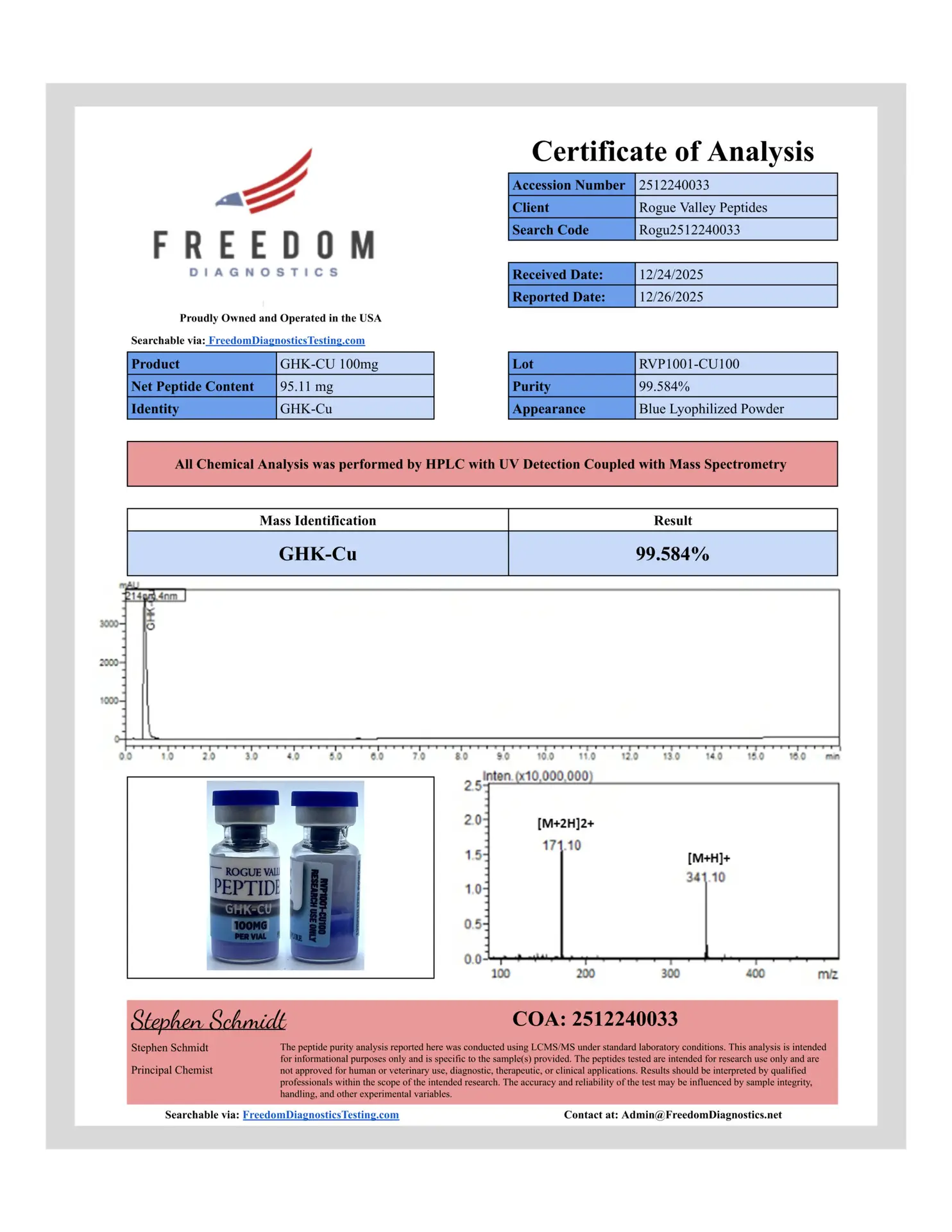 GHK-Cu is a naturally occurring peptide that consists of glycine, histidine, and lysine bound to a copper ion. It is involved in tissue repair and regeneration and is used in skincare for anti-aging, wound healing, and stimulating collagen production. It can also promote hair growth by nurturing the scalp.